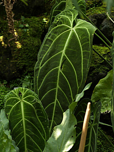 別名ナガバビロードオオウチワ、コロンビア原産。葉は表面がビロード状で独特の光沢があり濃緑色、葉脈がくっきりと白く浮き出ます。葉は大きくなると長さ1m近くになります。