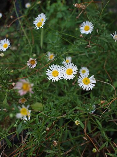 エリゲロンは北アメリカを中心とした世界各地に約200種類が知られています。日本でもよく見かけるおなじみの野草、ハルジオン〔E. philadelphicus〕やヒメジオン〔E. annuus〕 -どちらも海外から入ってきたものが野生化した帰化植物- そして高山植物のアズマギクもこの中に含まれます。
