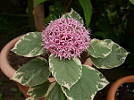 梅雨時から夏にかけて、ピンク色の小花がボール状にまとまって咲きます。その花姿は遠目から見るとアジサイっぽいかもしれません。花にはかすかな芳香があります。葉っぱは大きな丸形で、先端が少しとがります。色は濃い緑色で、もんだりこすったりすると一種独特なニオイがします。葉っぱに斑の入る園芸品種があります。
