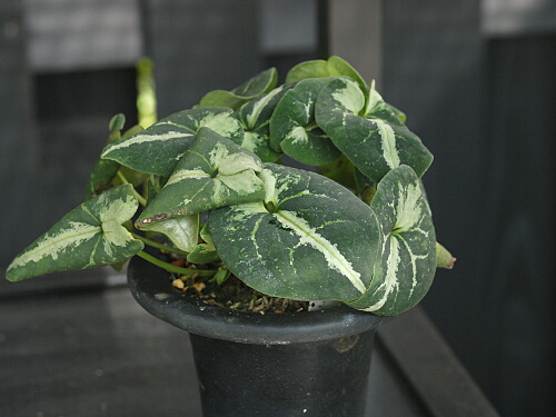 草丈は高くならず、節の多い根茎が地表や地面を這うように伸びていき、暗紫色の軸を伸ばして先端に葉を付けます。葉の形は心臓型で、種によって異なる様々な模様が入ります。開花は種によって異なりますが、主に早春から春で、葉の軸の付け根に1~数輪の花を咲かせます。花色は主に暗紫色で花びらは退化してなく、先端が3つに裂けた壺形のがく片から成ります。その花姿はユニークかつ奇妙です。