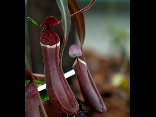 ボルネオ原産の大型種で、つるの長さは15mにもなります。捕虫袋のえりが極端にぐいっと上に伸び、その先端に牙のような2本の突起が下向きに付きます。