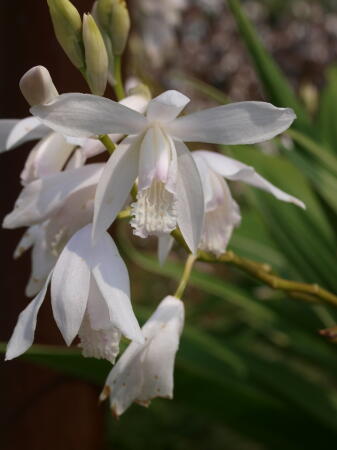 品種に花が白いシロバナシラン〔f. gebina〕や葉に白い縁取りが入るフクリンシラン〔f. albomarginata〕、花の先端に紫紅色が入る口紅シランなどがあります。ユニークなものにリップ(下向きに付くよく目立つ花びら、本来1輪に1枚付く)が3枚付く三蝶咲きシランがあります。