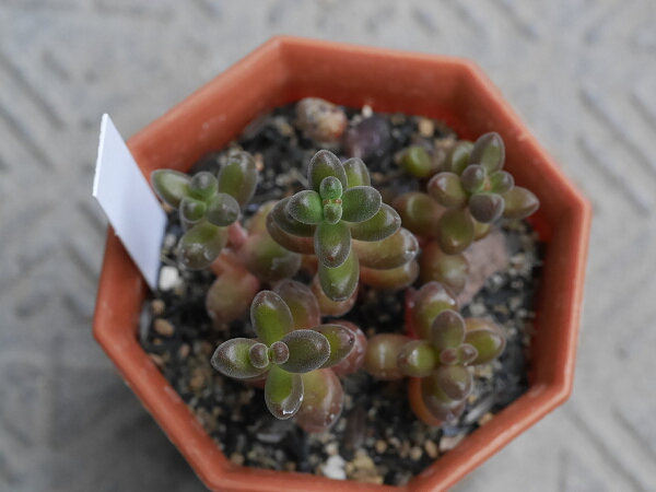 葉っぱが肉厚になる、メキシコ原産の多肉植物です。セダムと言うグループ(属)にはいります。葉っぱは長さが短くて厚みがあり、球や玉に近い形をしています。葉色はブドウのような暗赤色ですが、季節や栽培環境によって、ピンク色や緑色に変わります。肉眼では見にくいですが、葉っぱの表面には細かなうぶ毛が生えています。葉っぱは茎を挟んで左右に1枚ずつ付く対生ですが、一段ごとに90℃向きを変えて付くので、真上から見ると幾何学的な十字型に葉っぱが並びます。