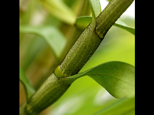 一般的なデンドロビウム(ノビル系)は冬から春に開花しますが、フォルモスム系は主に初夏~夏に花を咲かせます。地際から太い茎(バルブ)を伸ばして、その上部に2~3輪ずつ花を咲かせます。花色は白で大きさは径12cm程になります。茎の表面や葉裏に黒い短毛が細かく生えるのが特長です。